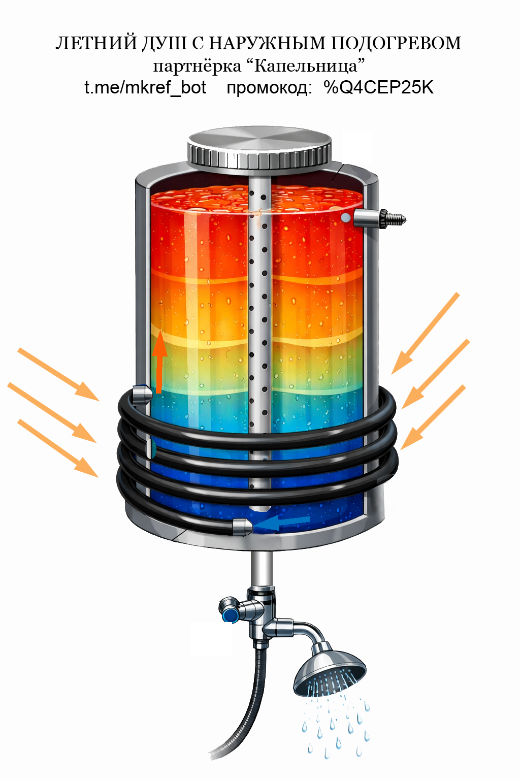 Итак, испытаем систему на примере какого-нибудь несложного проекта. Например, я решил сделать летний душ, и придумал (именно придумал, так как нигде не видел) вот такую конструкцию. Знающему человеку должно быть всё понятно из рисунка, но на всякий случай я поясню: Для того, чтобы вода в баке нагревалась равномерно, её приходится регулярно перемешивать. Раньше я это делал с помощью аквариумного насоса внутри бака. Затем возникла идея с использованием естественной конвекции, без использования электричества. Для этого решил использовать чёрную ПВХ трубу, обмотанную вокруг нижней части бака. В качестве бака решено использовать вертикальную цилиндрическую бочку вместо плоской квадратной. Такая форма обеспечивает достаточную конвекцию, и процесс нагрева практически не зависит от положения солнца. Какая моя цель: Во-первых, хочу поделиться своей идеей с другими, почитать советы и предложения. Во-вторых, хочу на этой идее заработать немного денег на её воплощение. Если Вы готовы присоединиться и протестировать систему - пожалуйста, зарегистрируйтесь с помощью телеграм бота https://t.me/mkref_bot указав при этом промокод %Q4CEP25K, получите и сохраните новый промокод. Если Вы хотите разместить тему в другом месте - размещаете, но не забудьте заменить старый (чужой) промокод новым (своим). Если Вы хотите изменить и улучшить конструкцию (например, Вы считаете, что к баку следует добавить теплоизоляцию, чтобы он дольше сохранял тепло) - улучшаете и публикуете улучшенную версию, но не забываете заменить чужой промокод на свой. Если желаете просто попробовать и понять, как работает партнёрка - потренируйтесь на тестовом промокоде %2GYV9XTD Цена указана символическая (это требование платёжной системы), можно поддержать проект любой суммой, или не поддерживать совсем.