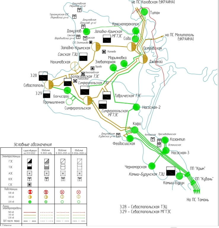 Карта-схема размещения линий электропередачи, подстанций напряжением 220 кВ и выше и электростанций Республики Крым и города Севастополь на 2022 – 2028 годы Источник https://energybase.ru/map/map-substations-powerplants-crimea-sevastopol Увы, только магистральные сети, ниже 220 не показаны ...