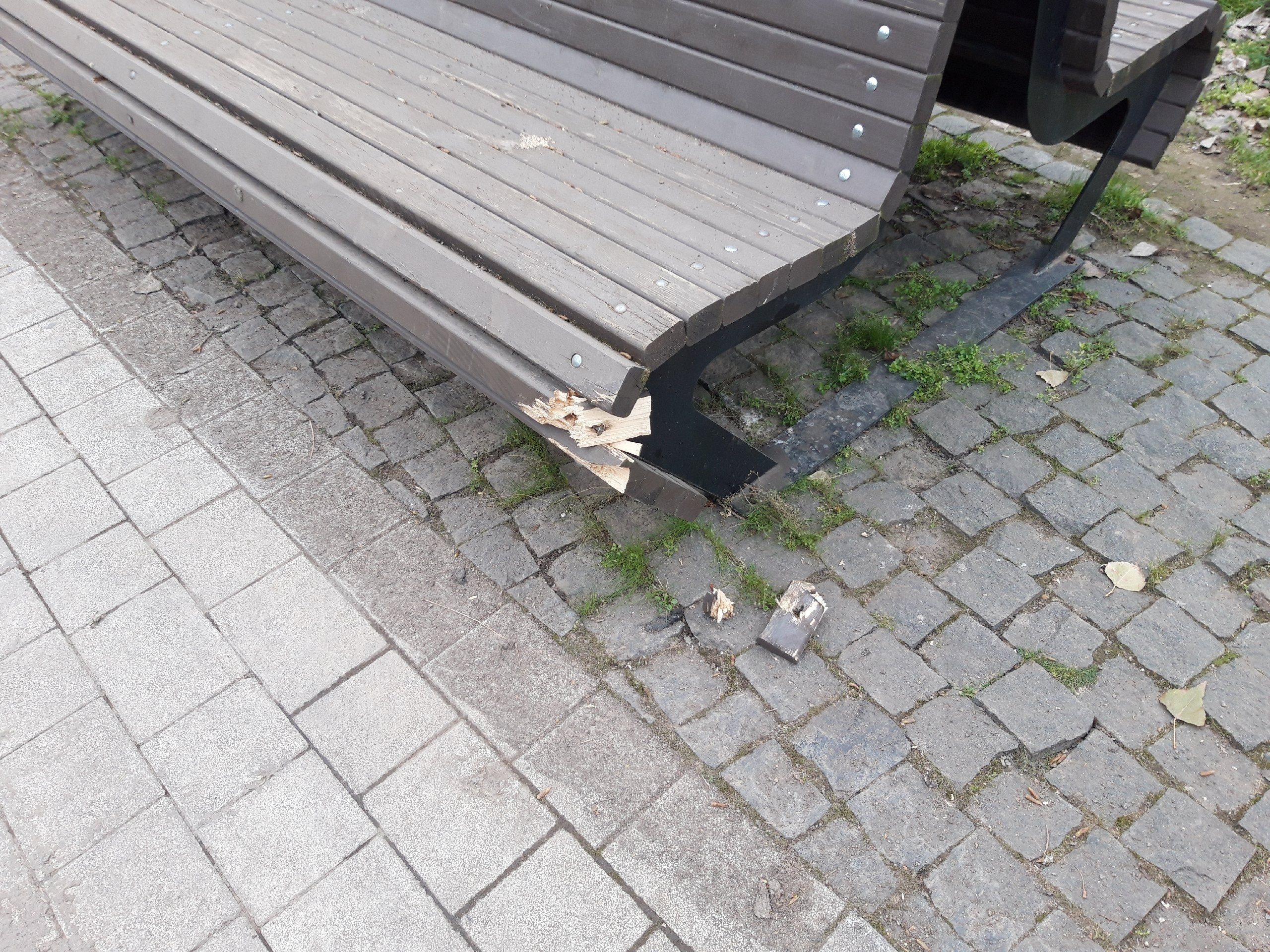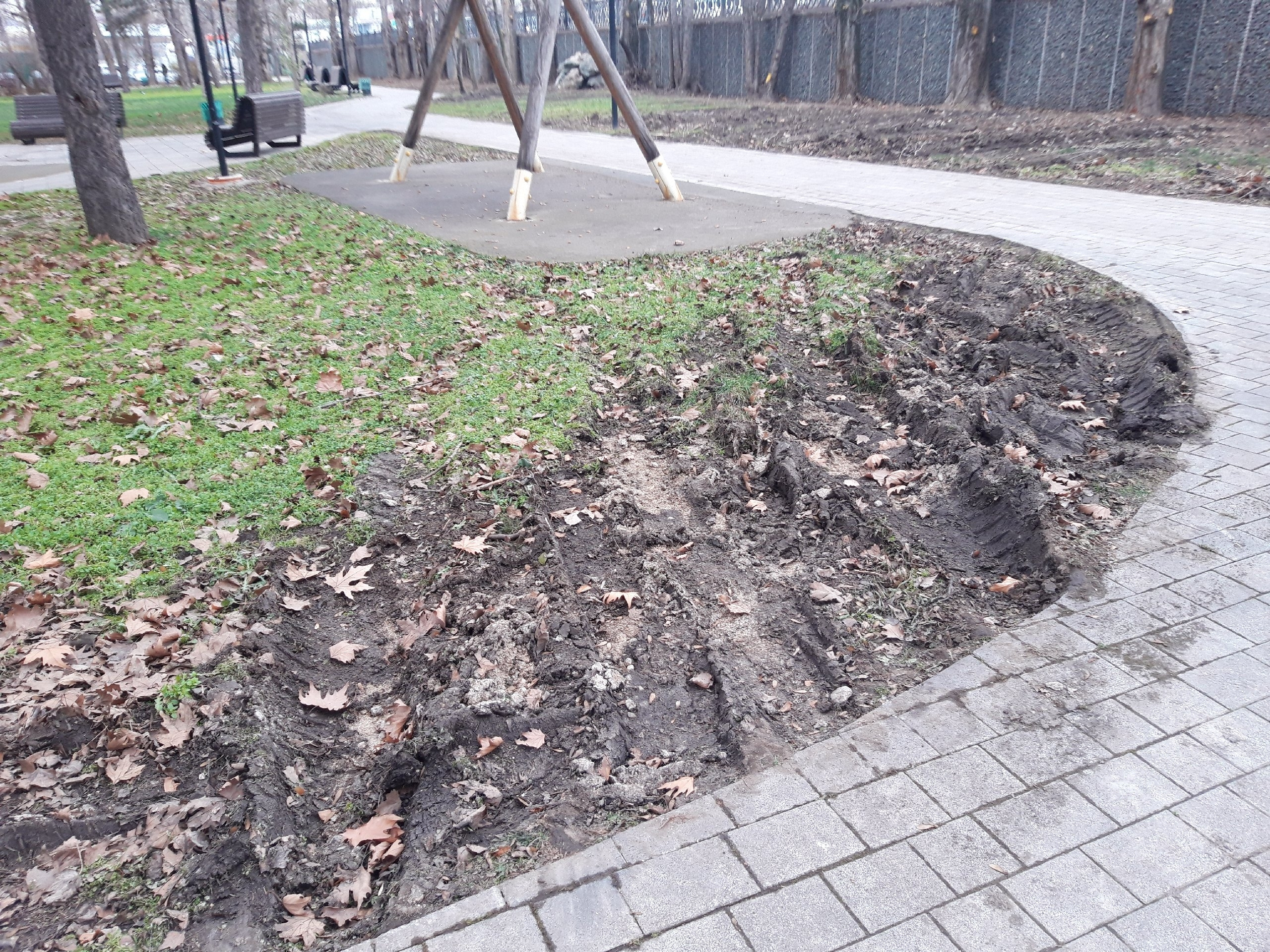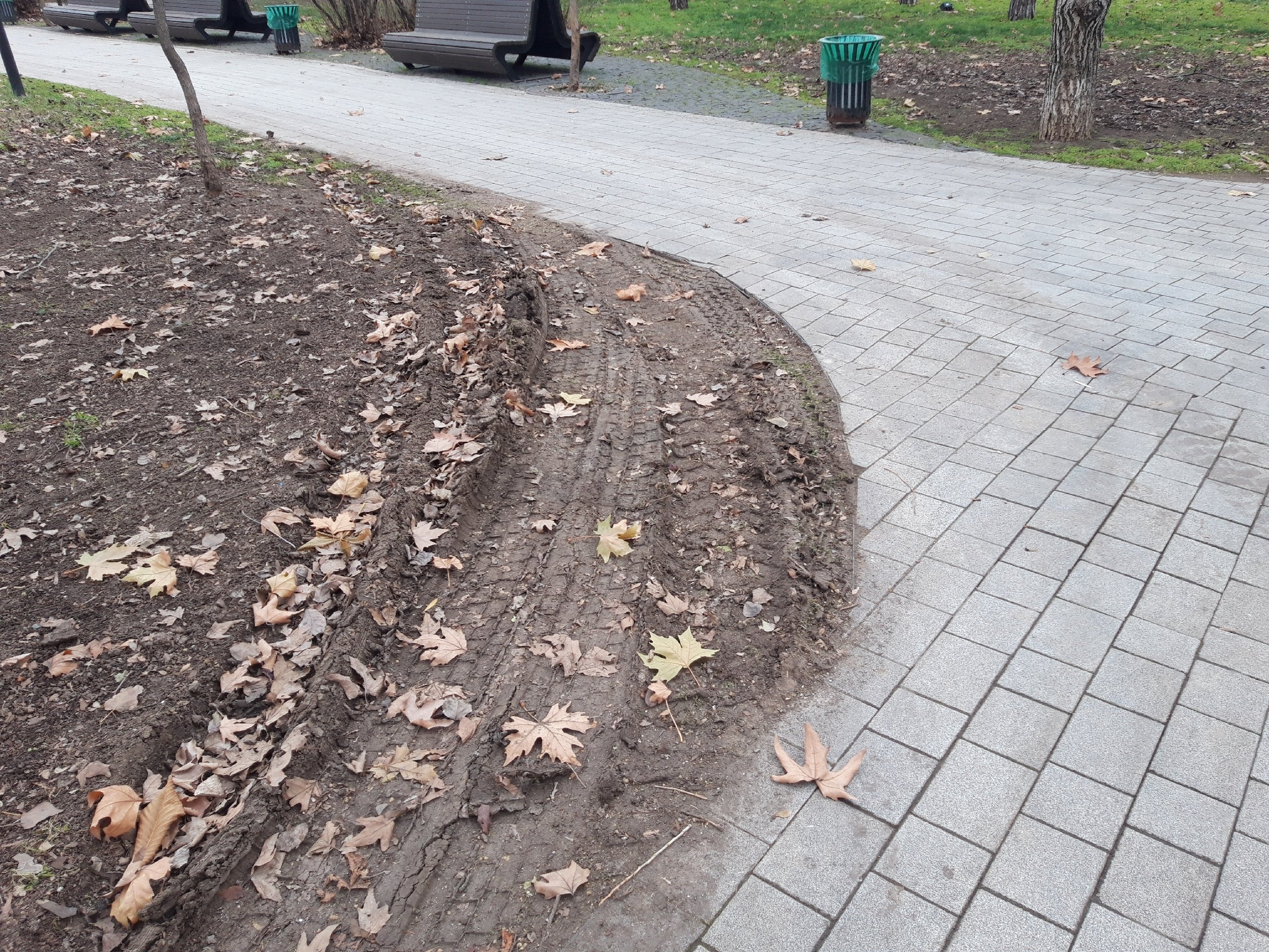 Помните, я обещал фотки из изуродованного топпингистами сквера? Вот. Сломано 3 скамейки. На первом фото видно, что скамейка притёрта колесом автомобиля, в результате чего сломана. На втором фото скамейку сломали, скорее всего, подметальной машиной. Да, как ни странно, приехала машина убрать грязюку. Качество уборки вы ещё увидите ниже, а сломанная скамейка вот она. Третью скамейку отломали вовсе. И приставили к обтоппингованному тополю. Это так мило. Вот здесь когда-то был газон. Этот рулонный газон (я сам лично видел) укладывали женщины стоя на коленях. Тяжёлый труд и куча денег. Продавленная плитка. Много мест: Грязюка, натасканная колесами: А вот тут увлеклись. Ну, подумаешь, одним тополем меньше: Качество уборки)) Ну что я вам скажу, сквер нужно опять закрывать на реконструкцию. Сколько убытка принесли эти пилильщики? За чей счёт будет проводиться восстановление уничтоженного? -