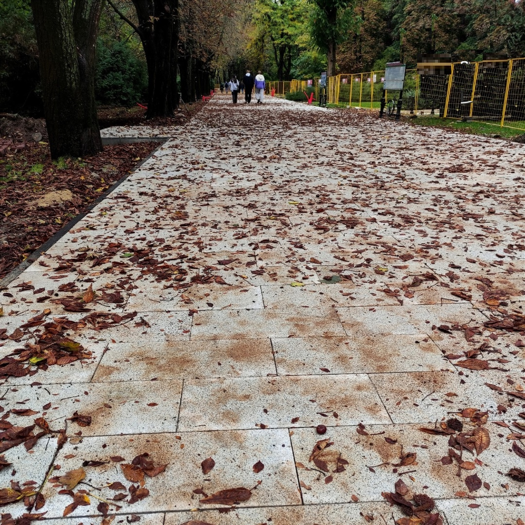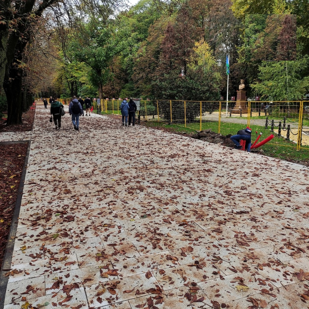 Реконструкция в парке им. Гагарина. Сняли асфальт и положили плитку. Белую. Белую, Карл!!!! И я, таки, знаю выход. Спилить к чертям эти проклятые деревья в парке. Нехер свои листья на нашу новую белую плитку бросать! - Сегодня