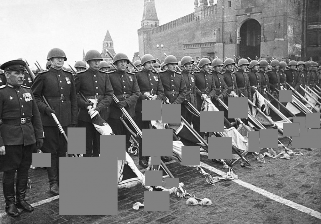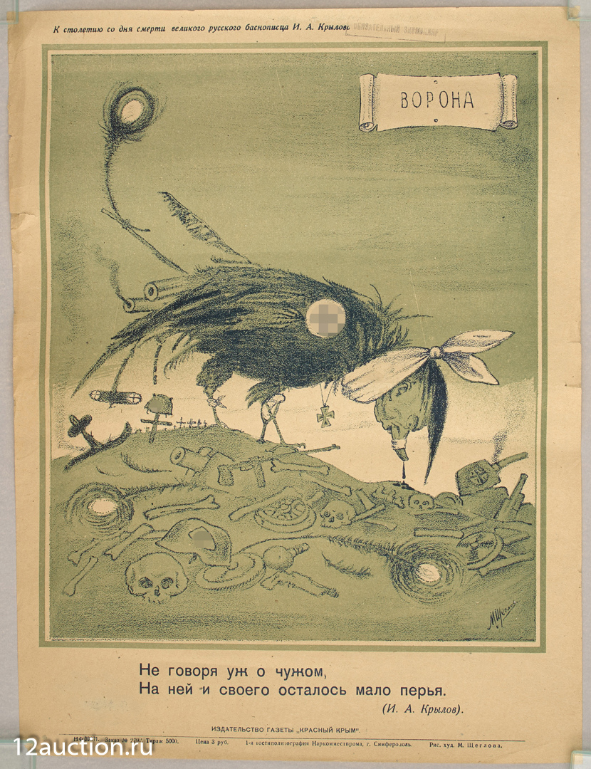 Плакат, отпечатанный в Симферополе к 100-летию .А. Крылова. Издательство газеты "Красный Крым", 1944 год, 40х30,5 см., 5000 экз., цветная литография. https://ru.bidspirit.com/ui/lotPage/12stulauction/source/search/auction/65774/lot/195037/Крым-1944-Щеглов-М-худ?lang=ru Заретушированная свастика как "утрата" - дефект, приобретенный предметом со временем.