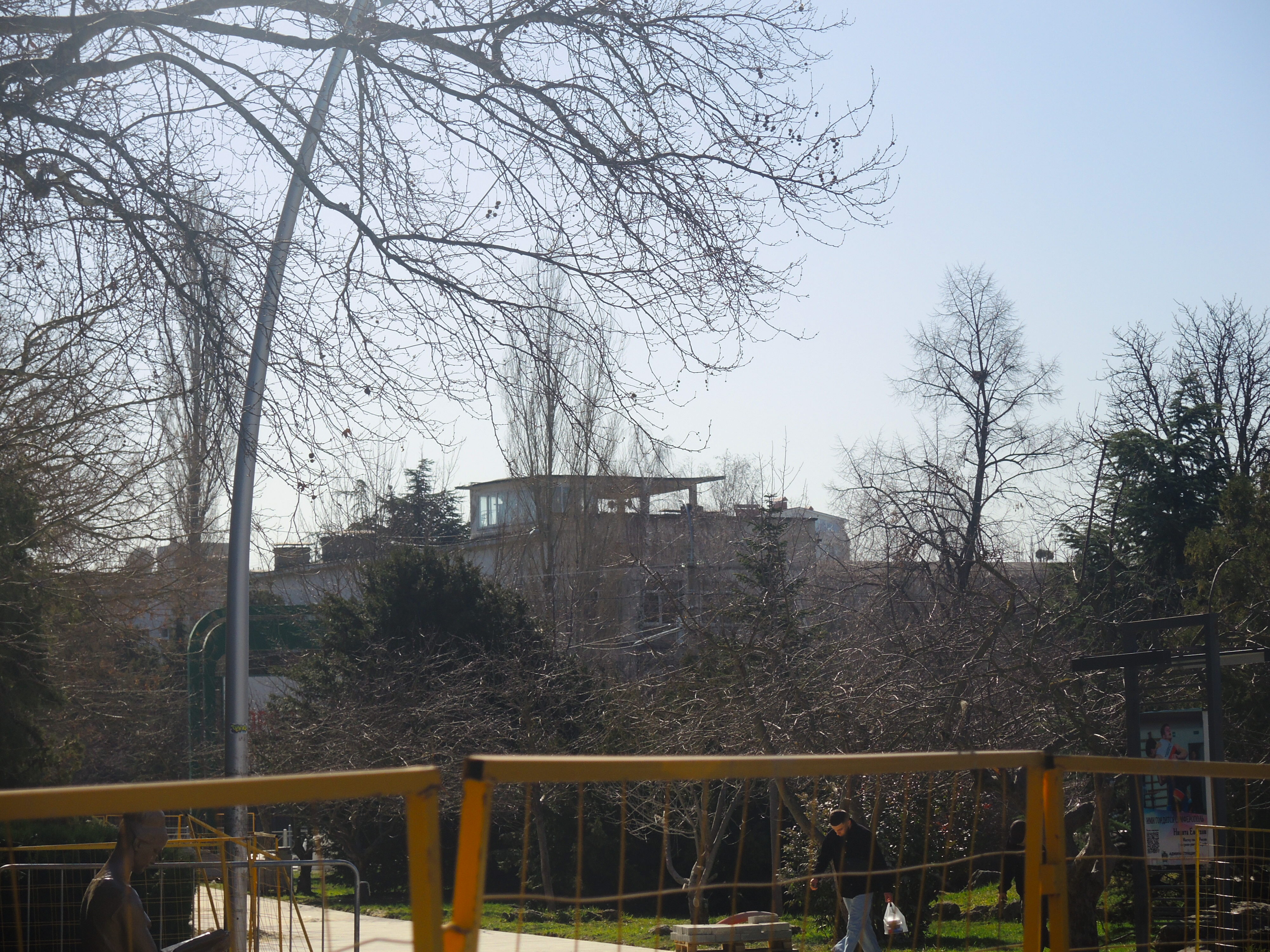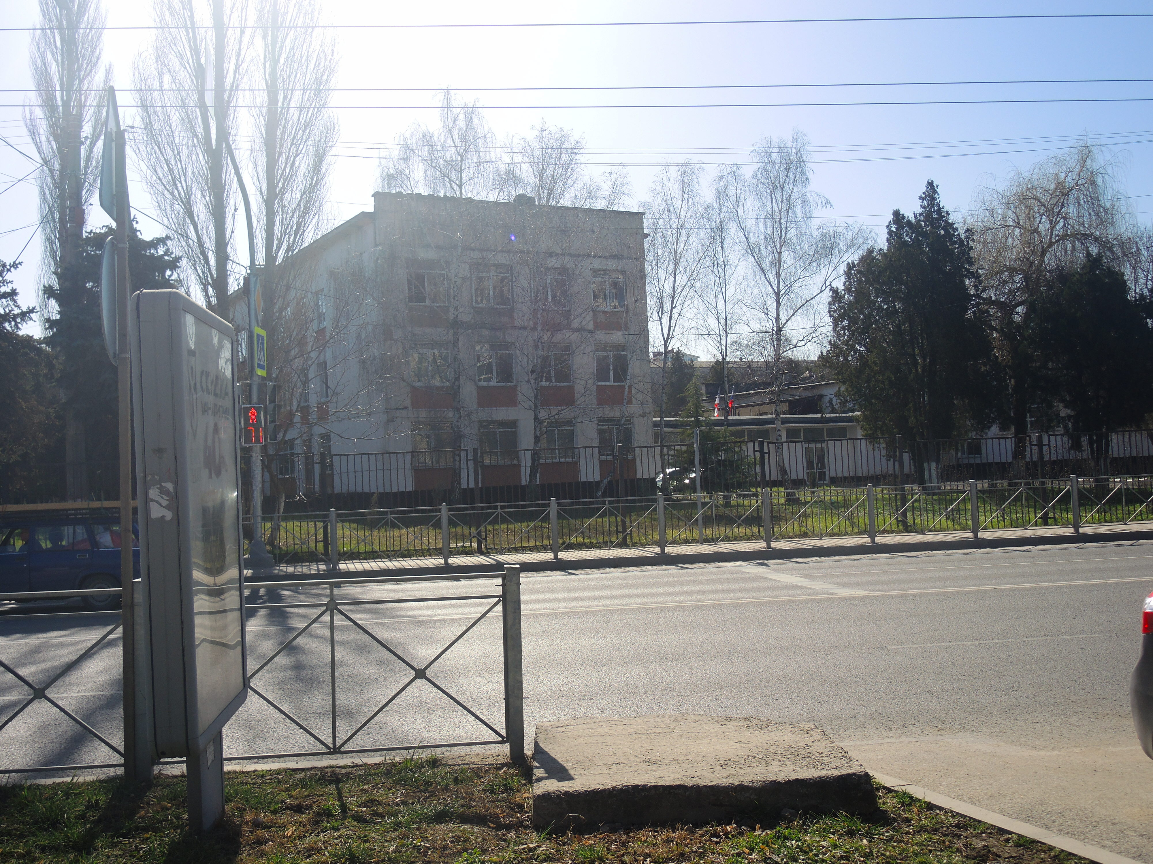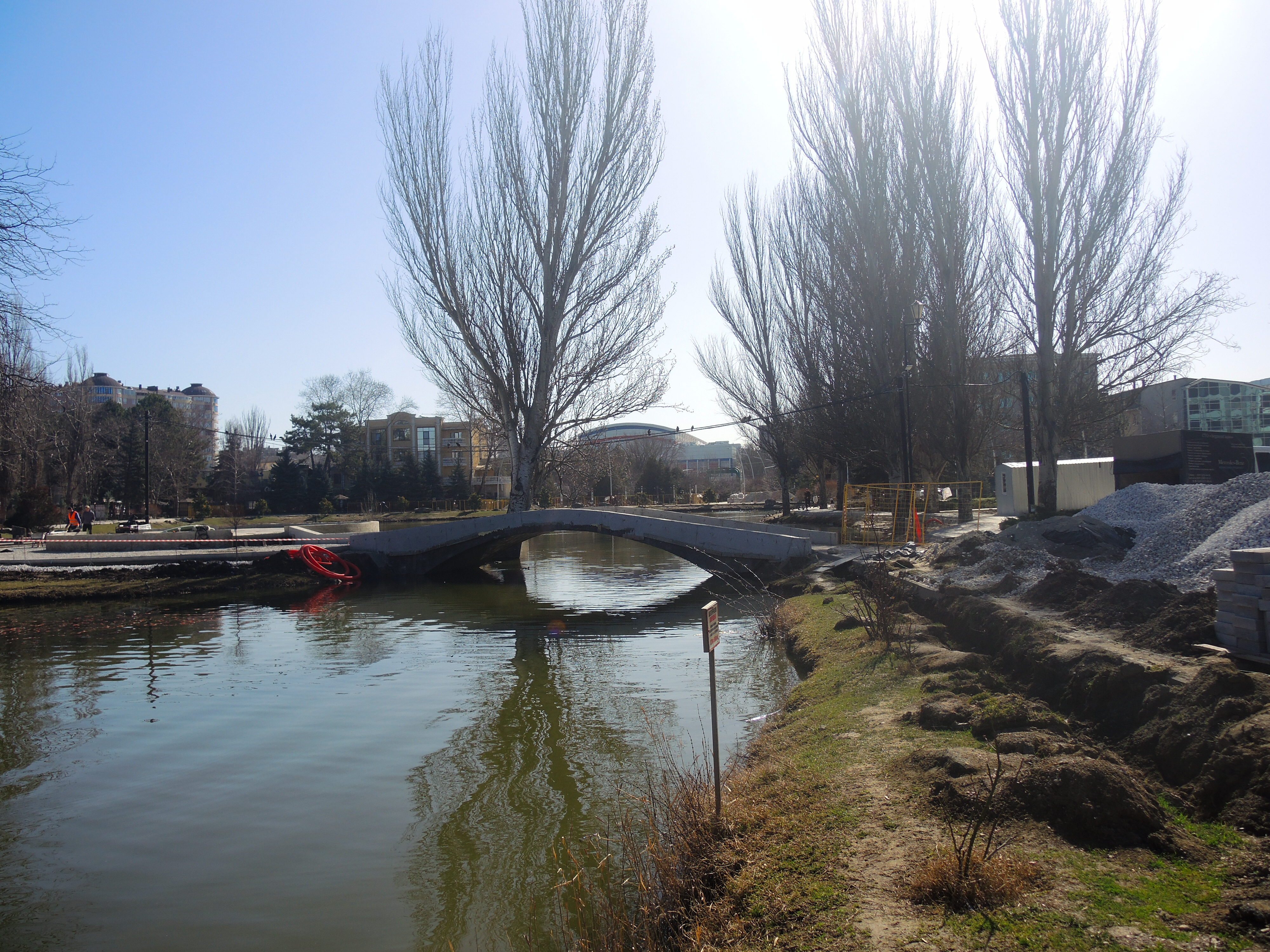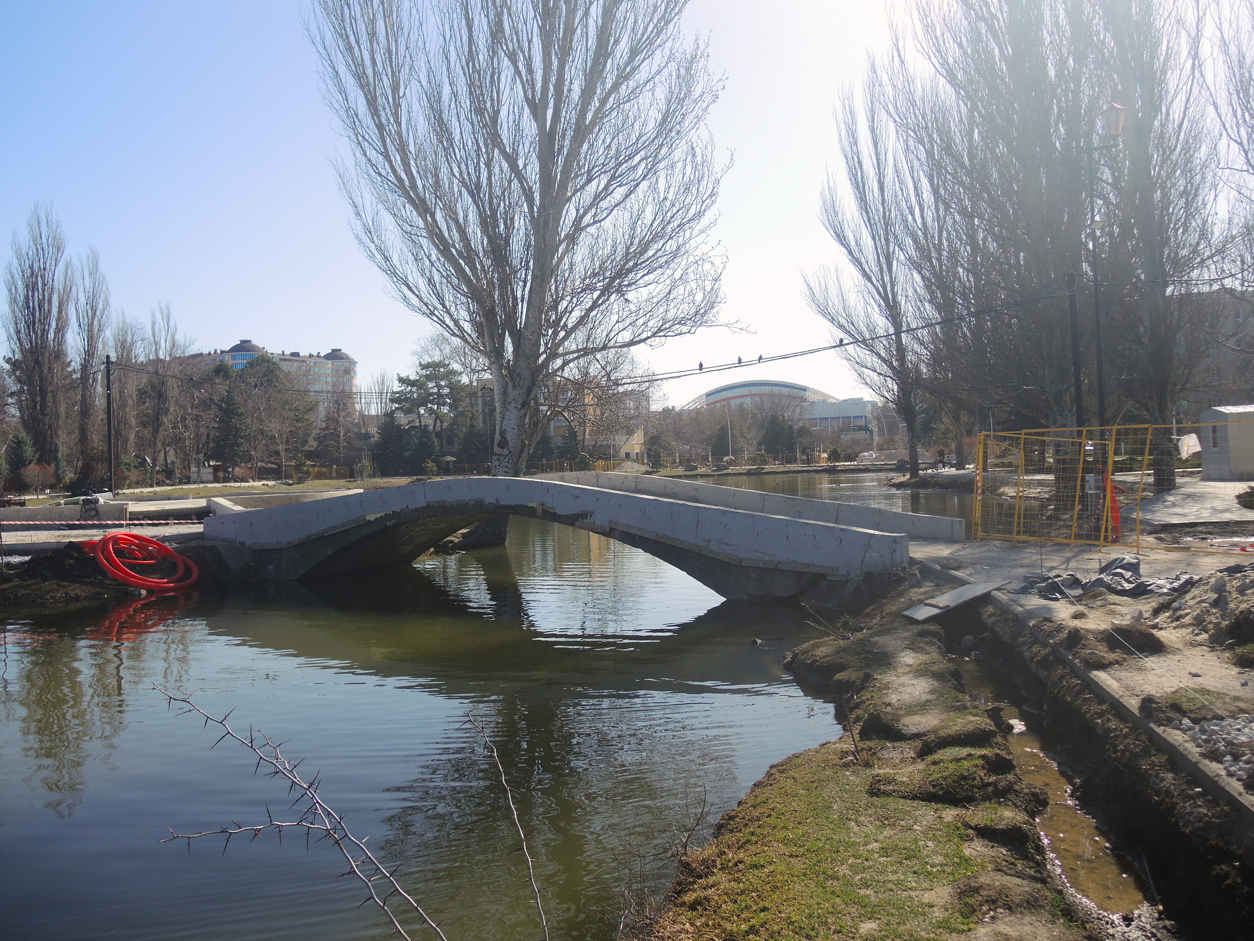 Заскочила сегодня в парк Гагарина сделать несколько фото в подтверждение. К сожалению, точно повторить ракурс не получилось - из-за ремонтных работ в самом парке и застройки перспективы, но: обратите внимание на крышу здания - обведено зелёным прямоугольником и на крышу школы. А также на участок между мужчиной и женщиной, стоящими справа на мосту, обведённый розовым. Это виднеется металлический знак в виде косого прямоугольника, который стоял возле газона, недалеко от Танечки. Что там было начертано уже и не помню.5 баллов